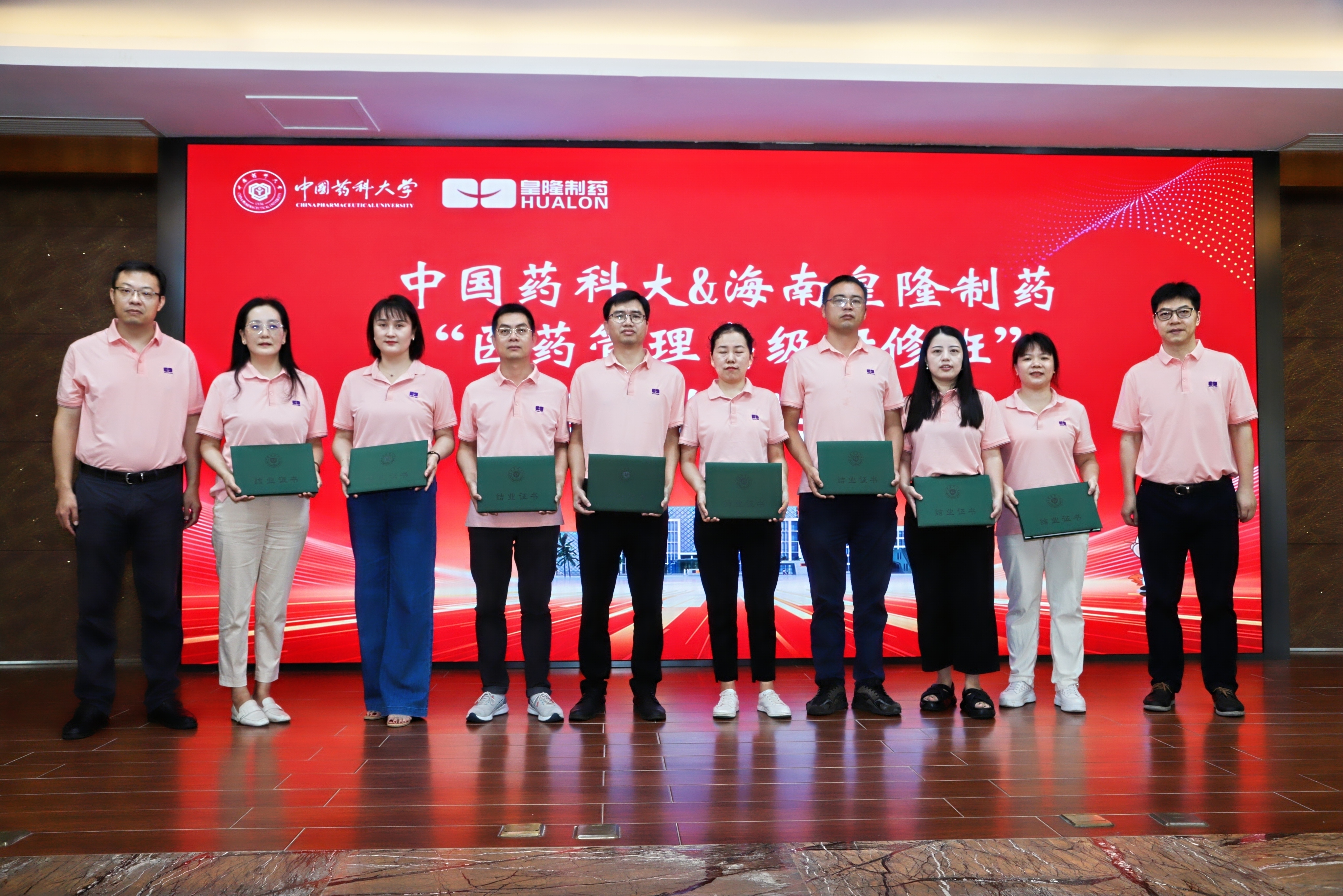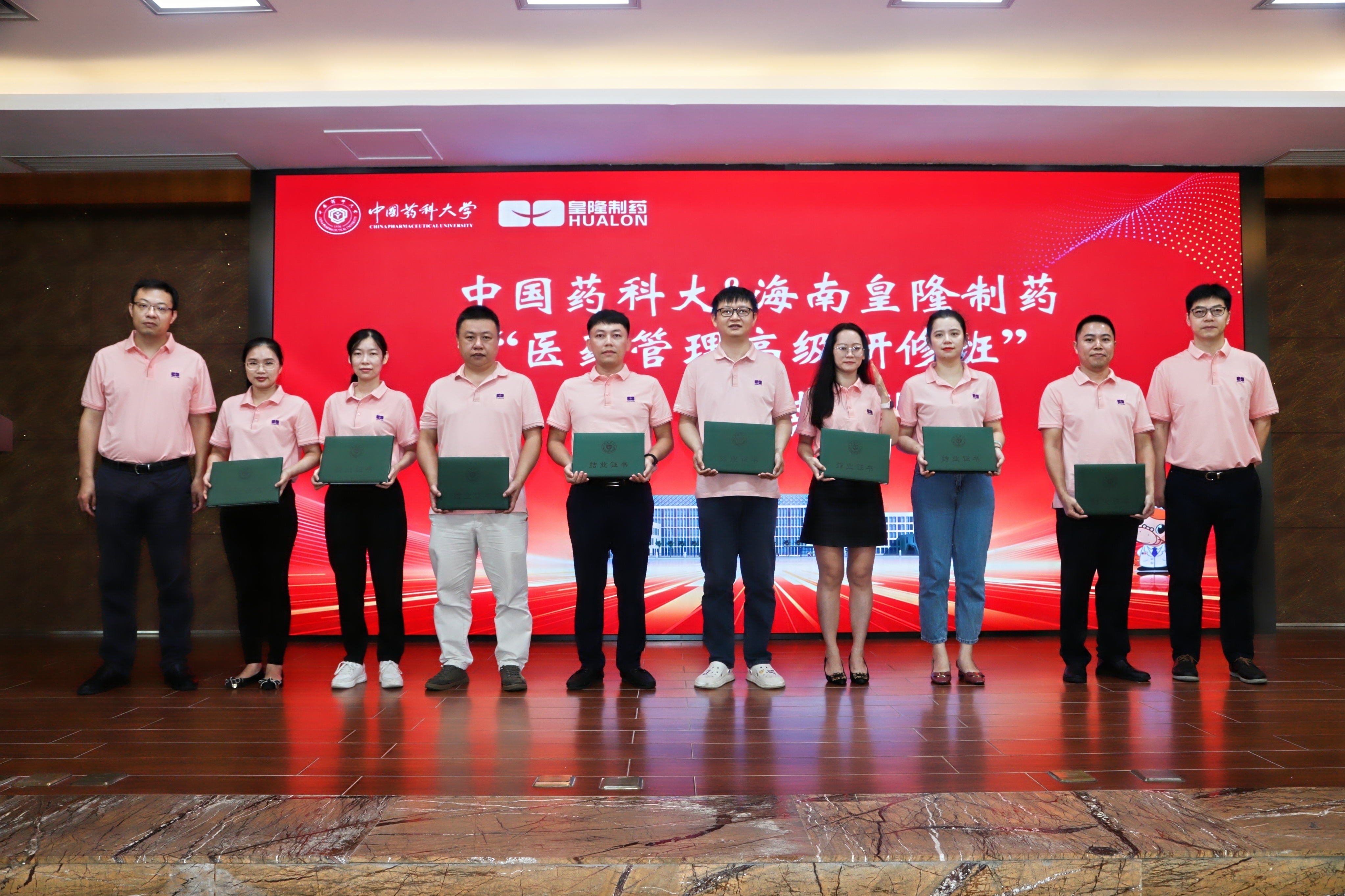 7月23日上午,中國藥科大學(xué)“專業(yè)學(xué)位研究生院級實踐基地”揭牌儀式暨中國藥科大學(xué)&海南皇隆制藥“醫(yī)藥管理高級研修班”結(jié)業(yè)典禮在海南皇隆制藥股份有限公司成功舉行。??趪腋咝录夹g(shù)產(chǎn)業(yè)開發(fā)區(qū)工委副書記、管委會主任李杉、中國藥科大學(xué)研究生院副院長李飛、中國藥科大學(xué)國際醫(yī)藥商學(xué)會副院長徐偉、海南皇隆制藥股份有限公司董事長陳益智、公司管理層以及54名學(xué)員共同參加了本次儀式。